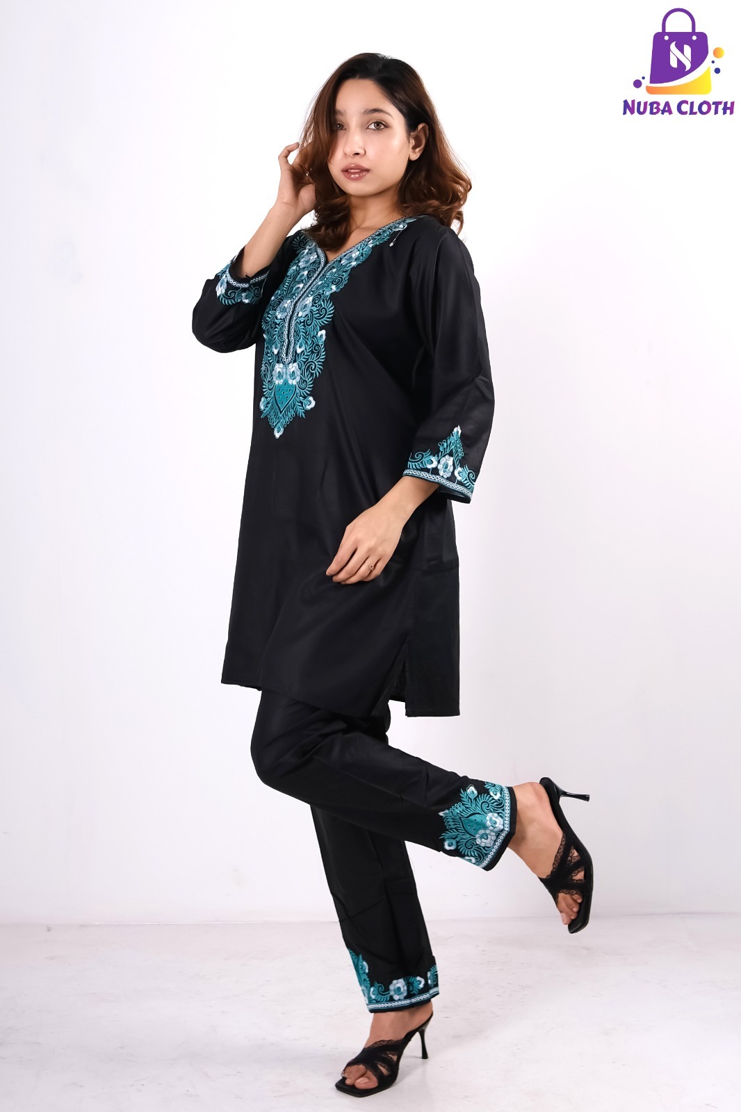 Step into timeless elegance with our Midnight Azure Embroidered Cotton Kurti, designed to bring the perfect combination of sophistication, comfort, and festive beauty. This stunning kurti features a deep classic black base highlighted with beautiful turquoise blue floral embroidery along the neckline and sleeve borders, creating a refined and graceful look.
