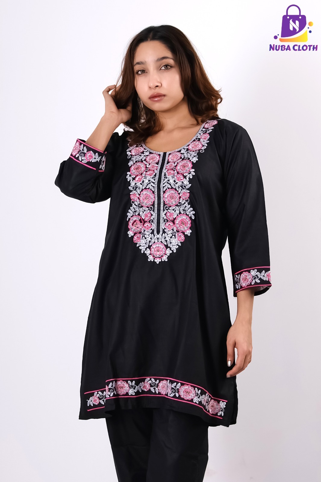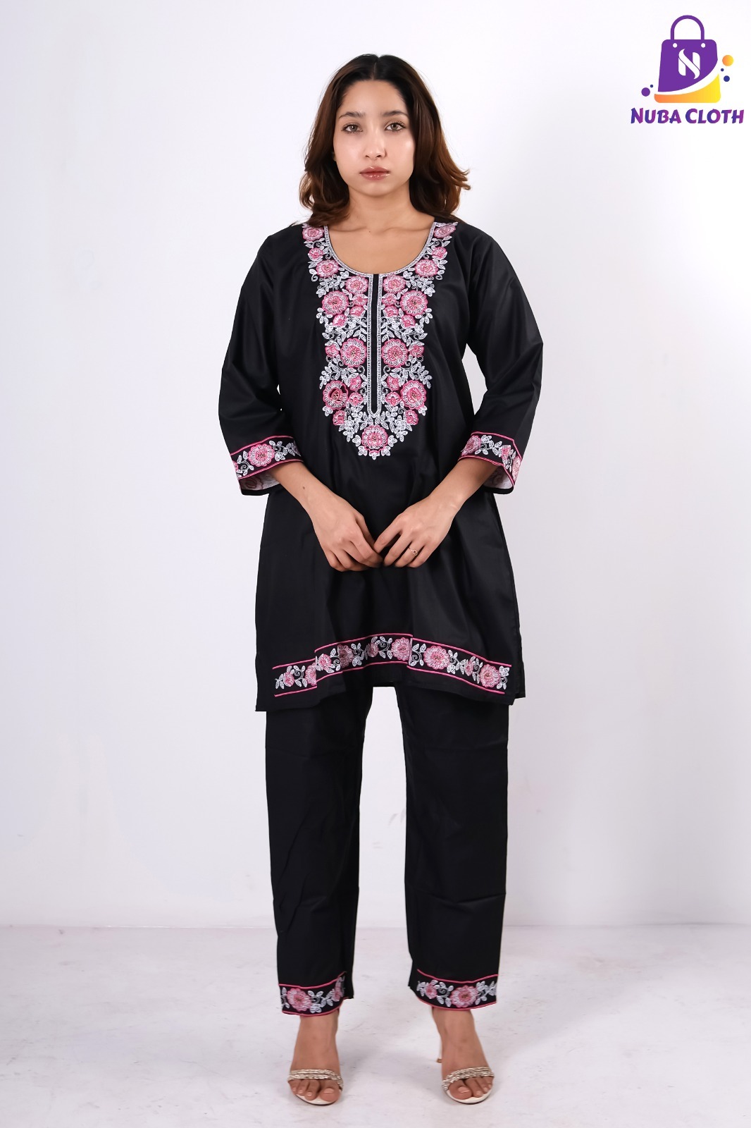 Upgrade your festive wardrobe with our Elegant Noir Pink Embroidered Cotton Kurti Set, a beautiful blend of traditional craftsmanship and modern style. This stunning outfit features a classic deep black base decorated with delicate pink and white floral embroidery across the neckline, sleeve borders, and hemline, creating a graceful and sophisticated look.
