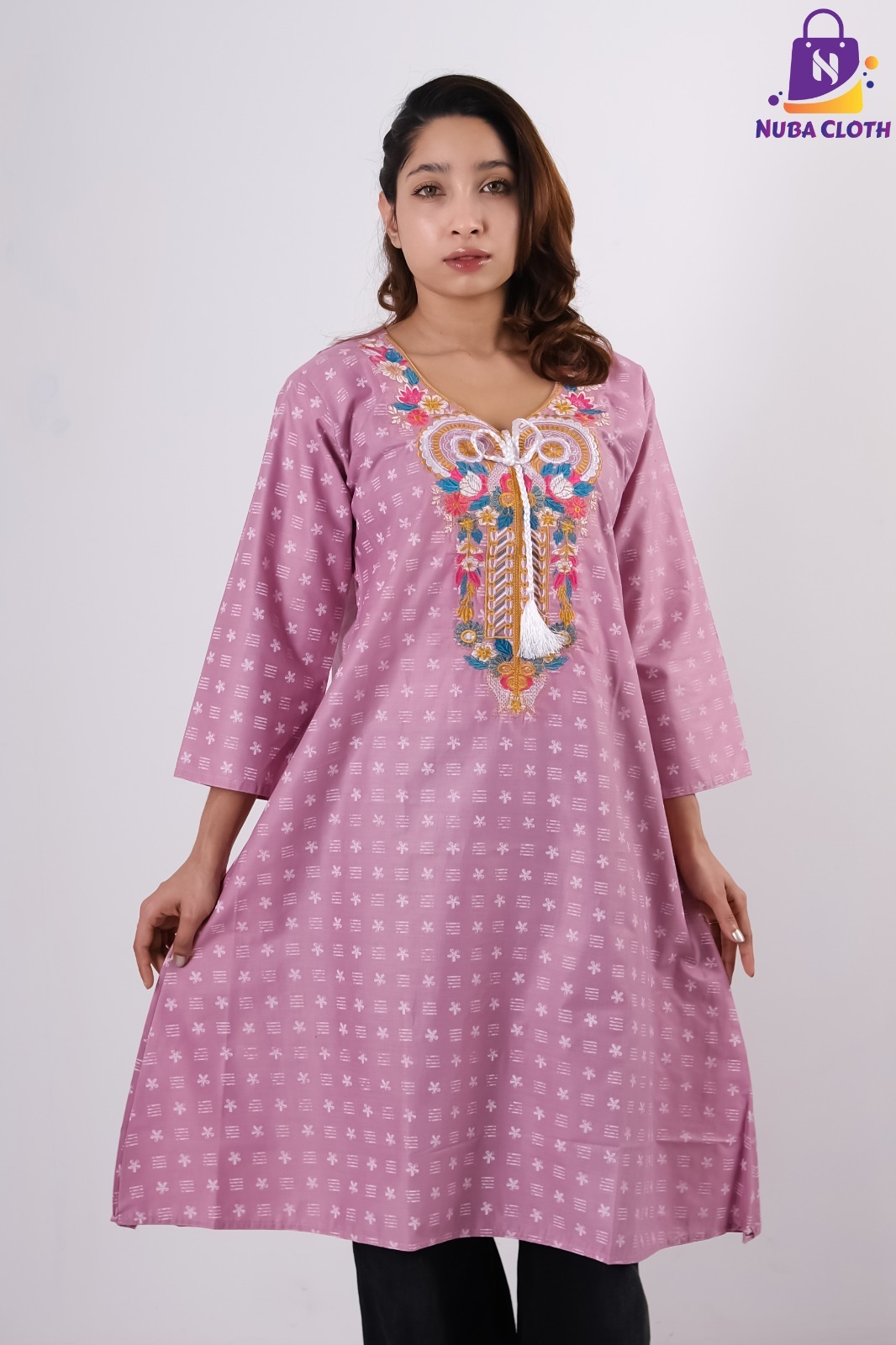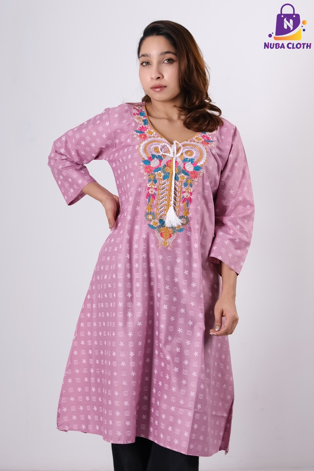 Discover the perfect blend of artistic detail and modern style with the Mauve Harmony kurti. This stunning mauve Soft Cotton Kurti is designed for the trendsetter, featuring vibrant multi-colored chest embroidery in shades of teal, gold, and pink. The look is finished with a trendy handcrafted white braided tassel at the V-neckline and a subtle all-over micro-print that adds premium texture to the entire Ladies Cotton Dress.